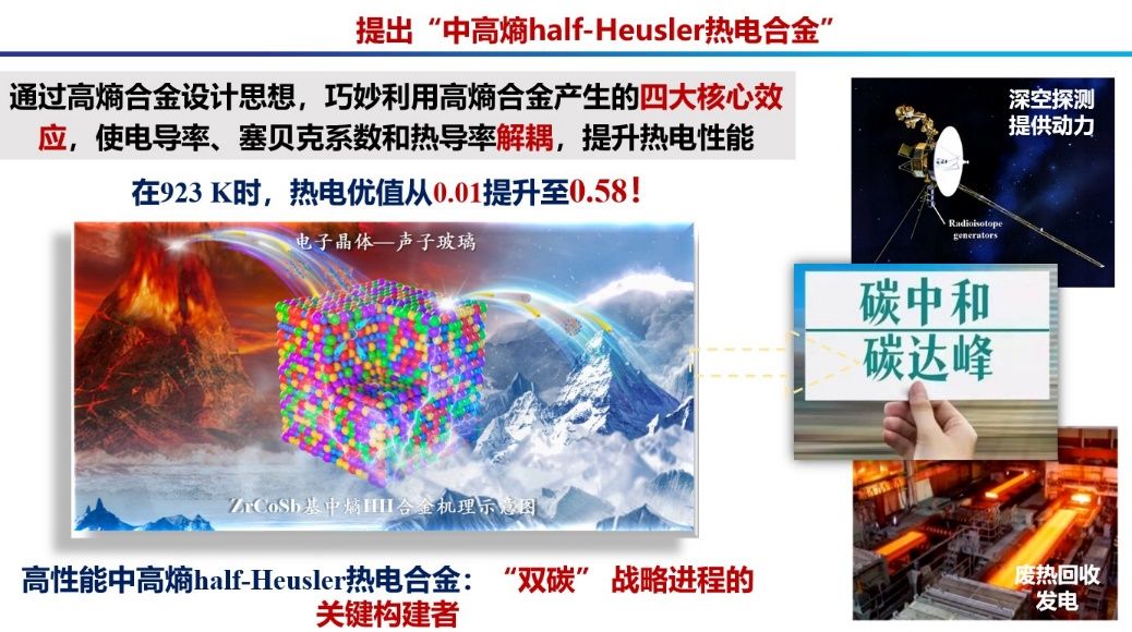 目前,高性能热电材料是引领新型能源技术产业变革的排头兵。与传统发电机和制冷机相比,热电器件具有无噪声、无污染、无震动、无泄漏和移动灵活等优点,既可应用于航空航天、军事、信息、医疗服务和深空探测等高技术领域,也有望大规模应用于工业和日常生活中。然而,较低的热电优值和热电转换效率制约了传统热电材料的产业化应用。