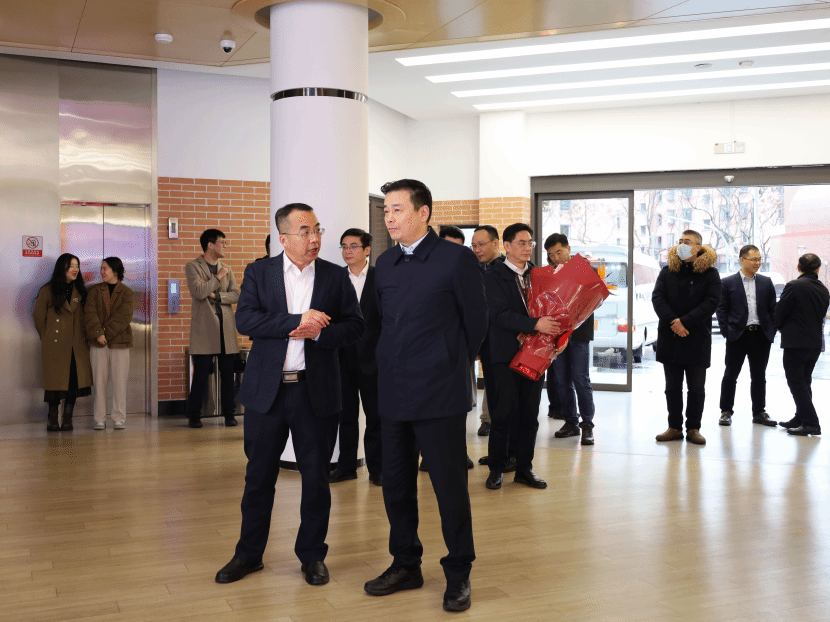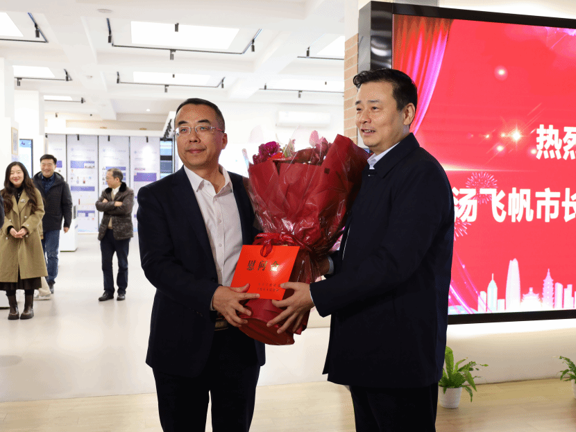 汤市长一行在郝院长的陪同下观看了我院宣传片并参观展厅,详细了解了我院建院历史,五大创新中心及下设团队研究方向、取得成果等基本信息,对我院发展建设情况表示高度赞扬,并勉励我院在服务地方经济发展和行业共性平台建设上继续发挥重要作用。最后,汤市长向郝院长赠予慰问花束并合影留念。