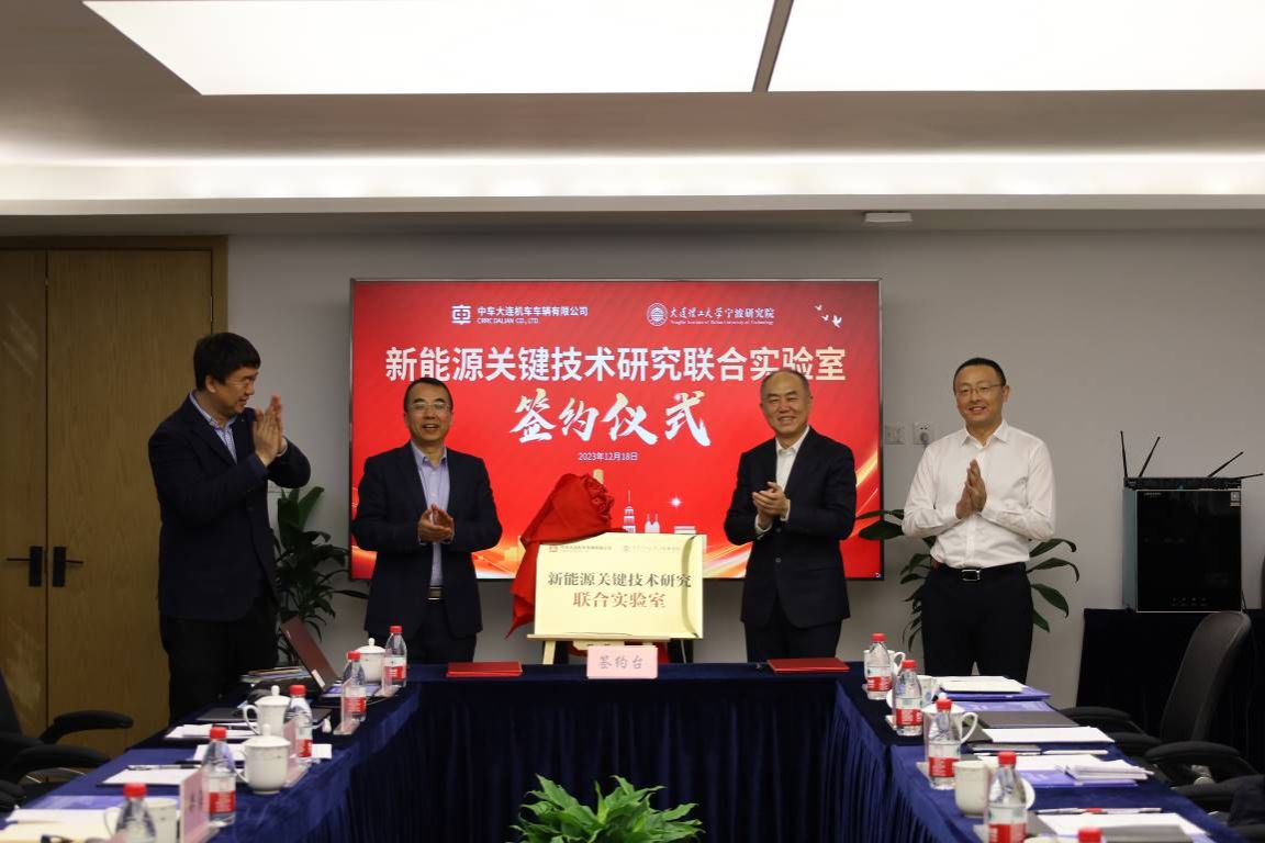 随后,举行了新能源关键技术研究联合实验室的揭牌仪式。中车副总经理、财务总监张乐与我院海洋装备强度分析与创新设计团队负责人阎军教授进行签约,中车大连机车车辆有限公司党委书记、董事长林存增与我院院长郝海进行揭牌。