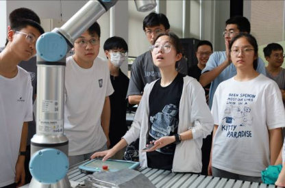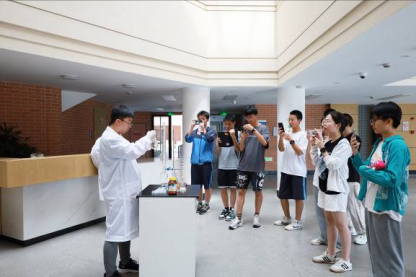 随后,孙部长带领科学营同学们来到精细化工与生物医药创新中心,高端装备与智能制造技术创新中心的部分实验室,现场观看研究人员的工作环境,研究人员们也准备了精彩纷呈的科学小实验及团队成果演示,理论与实践结合,通过知识讲解、现场试验、操作等环节让同学们对相关科学知识有了初步了解。先进光功能材料团队的马婉莹老师展示了光功能染料在医学中的应用,并现场进行了碘钟反应和大象牙膏这两个小实验,用到的化学试剂与高中课堂知识贴近,引发同学们对反应中化学方程式的思考。汽车轻量化与功能化设计团队的余旭东老师、智能制造与机器人创新团队的柯郑升老师以及超精密微细制造创新团队的陈俊杰老师也各自展示了团队内的先进技术,如应用于汽车领域的智能网联汽车环境感知计算,应用于工业领域的高精度视觉检测屏及数控车床等。
