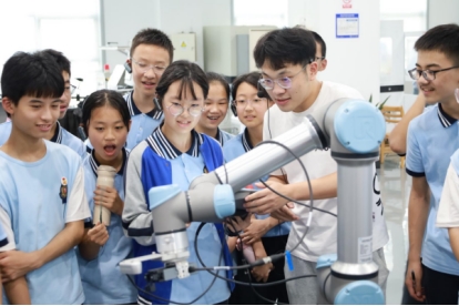 移步到研究院高端装备及智能制造创新实验室,相关科研人员向同学们展示了机械臂的简单操作与相关的程序制作,机械臂可以代替人类完成一些精细且有危险性的工作。听了科研人员的介绍,同学们跃跃欲试,为此科研人员组织同学们操作机械臂进行夹笔小游戏,通过亲身体验,对机械臂的强大功能与精细操作有了更深的了解。通过各位科研人员深入浅出的讲解,学生们近距离感受了科学的魅力,也在心底埋下了科技强国的种子。