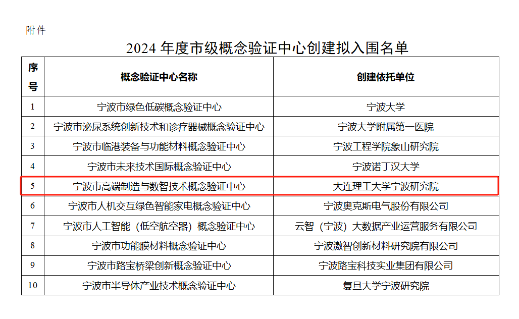 9月,研究院作为依托单位的“宁波市高端制造与数智技术概念验证中心”纳入宁波市首批市概念验证中心创建名单,是聚焦宁波市重点产业创新发展需求,通过优化整合人才、成果、资本和市场等要素,打造集技术可行性研究、性能测评、商业咨询、创业孵化等服务为一体的概念验证生态系统,减少转化风险,吸引投资,提高科技成果转化率的新型载体。