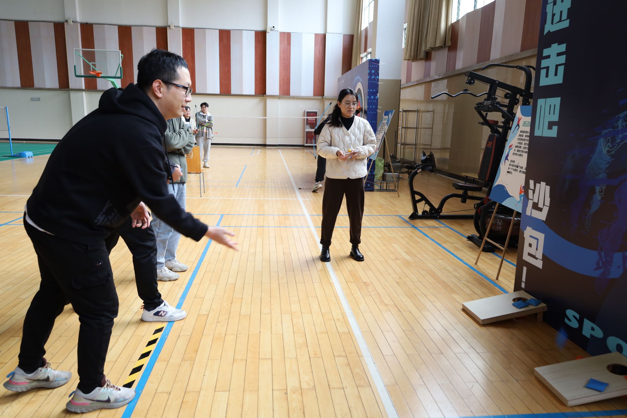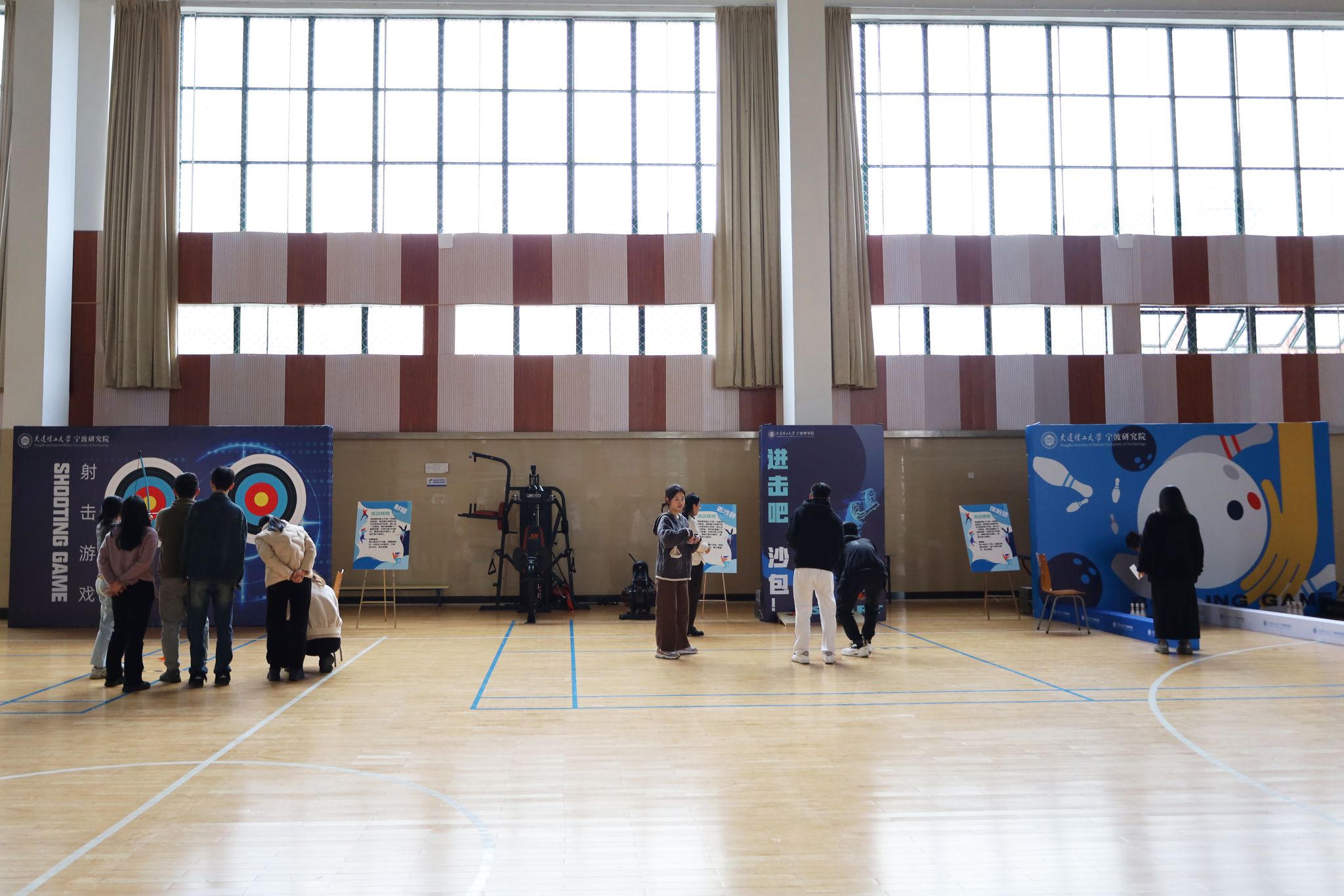 游园会由大连理工大学宁波研究院工会举办,采用积分闯关制,下设五个关卡,现场提供了沙包游戏、套圈游戏、九宫格飞盘游戏、射箭游戏、保龄球游戏5个趣味游戏。