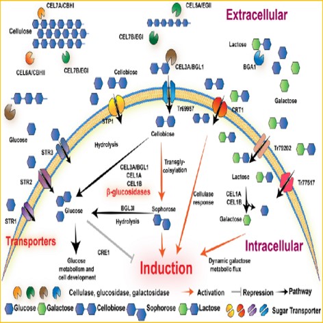 MGD(a mixture of glucose and sophorose), a cheap and efficient inducer, was prepared by transglycoside reaction. Based on the characteristics of cell growth and metabolism, the fed-batch of inducer was controlled to induce cellulase production efficiently; Genetic modification of Trichoderma reesei was carried out to improve the hydrolysis efficiency of lignocellulose and the total sugar yield of crude and compound enzyme solutions. Relevant technologies were applied in Sinopec Dalian Petrochemical Research Institute. The cellulase produced by Trichoderma reesei genetic engineering strain is superior to commercial enzymes in some enzyme production indicators, which contributies to breaking the foreign monopoly of cellulase and serving the development of national energy and environmental protection industries.