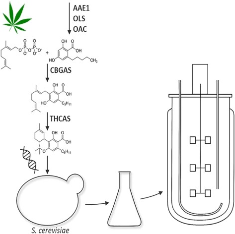 利用酿酒酵母、大肠杆菌等生物底盘细胞,从单糖开始实现天然产物和医药产品(大麻二酚,CBD)的全合成;优化代谢途径及发酵方法,获得高产菌株。将植物源和异源微生物的合成CBD的基因利用合成生物学技术导入酿酒酵母中,可用千平米发酵车间替代万亩良田生产大麻二酚。