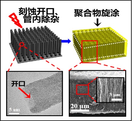 设计并制备了碳纳米管开口且阵列结构的有机复合膜,解决了碳管共混生长、刻蚀开口、管内除杂、多层涂覆等难题,实现了膜孔道的跨尺度精密控制。利用密度泛函理论计算和实验,揭示了甲烷、CO2、醇类等多种分子选择透过机理,该膜突破了传统膜通量和选择性不兼得的瓶颈,并建立了高浓度发酵耦合集成技术。