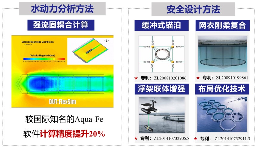 构建了深远海大型抗风浪养殖设施的水动力分析理论体系,解决了设施抗风浪设计的理论方法问题。提出了新的柔性网结构物理模型试验相似理论,解决了网箱的水动力物理模型试验方法问题。创建了“柔性+大位移+大变形”结构的水动力数值模拟方法,实现了网箱结构水动力数值模拟的精准计算。开发了国内首个网箱水动力分析软件,较国际最知名 Aqua-Fe 软件计算精度提升 20%。